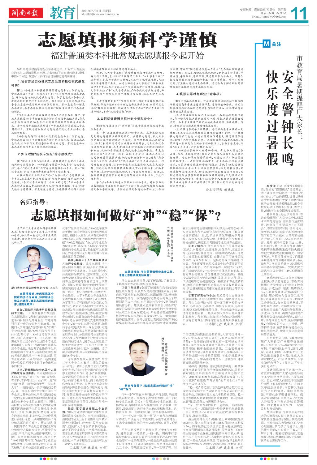 《闽南日报》2021年07月08日报道:名师指导志愿填报如何做好冲、稳、保(第11版)