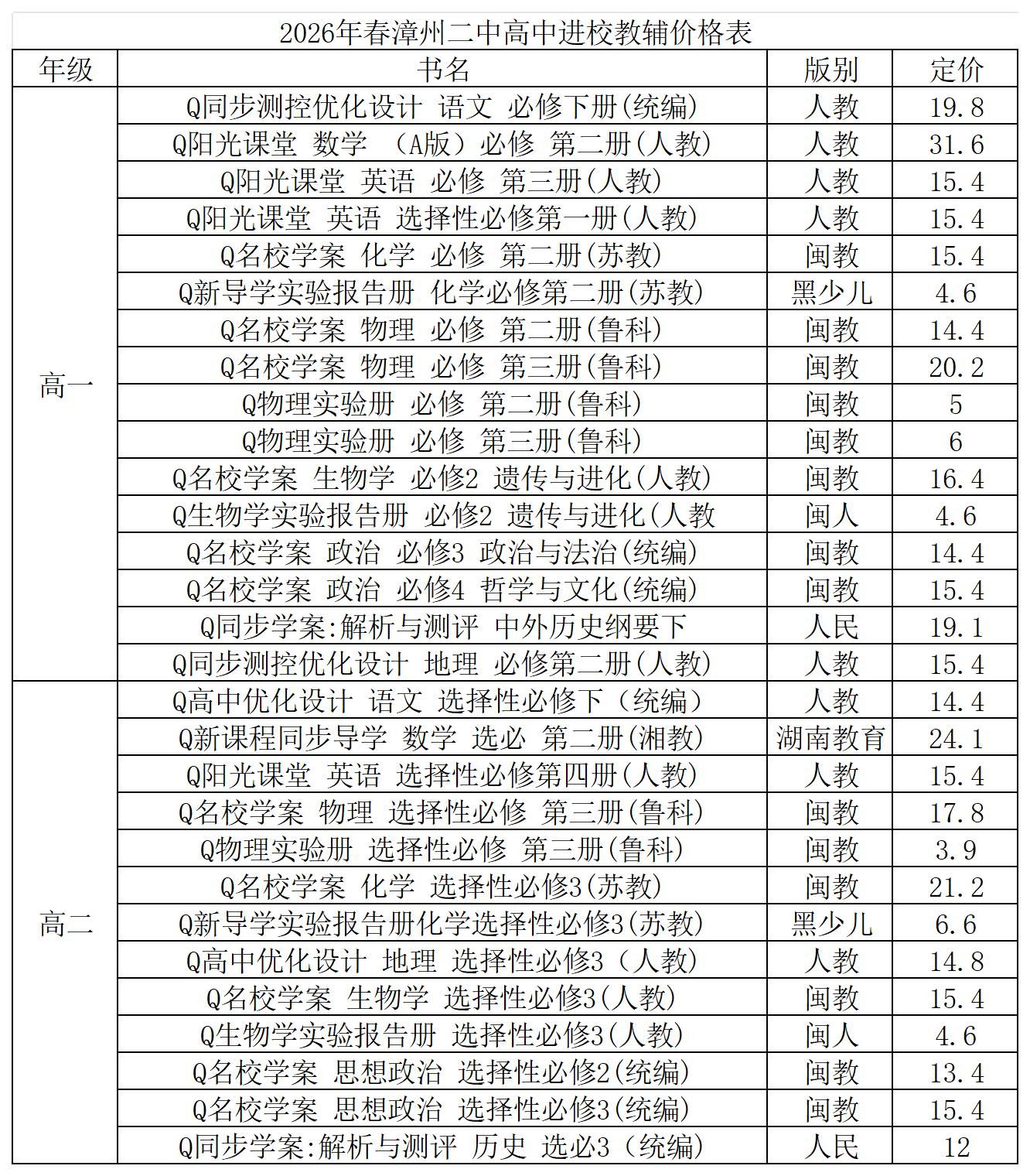 ylzz总站线路检测中心(漳州二中)关于2026年春季学期进校教辅材料代购的公告