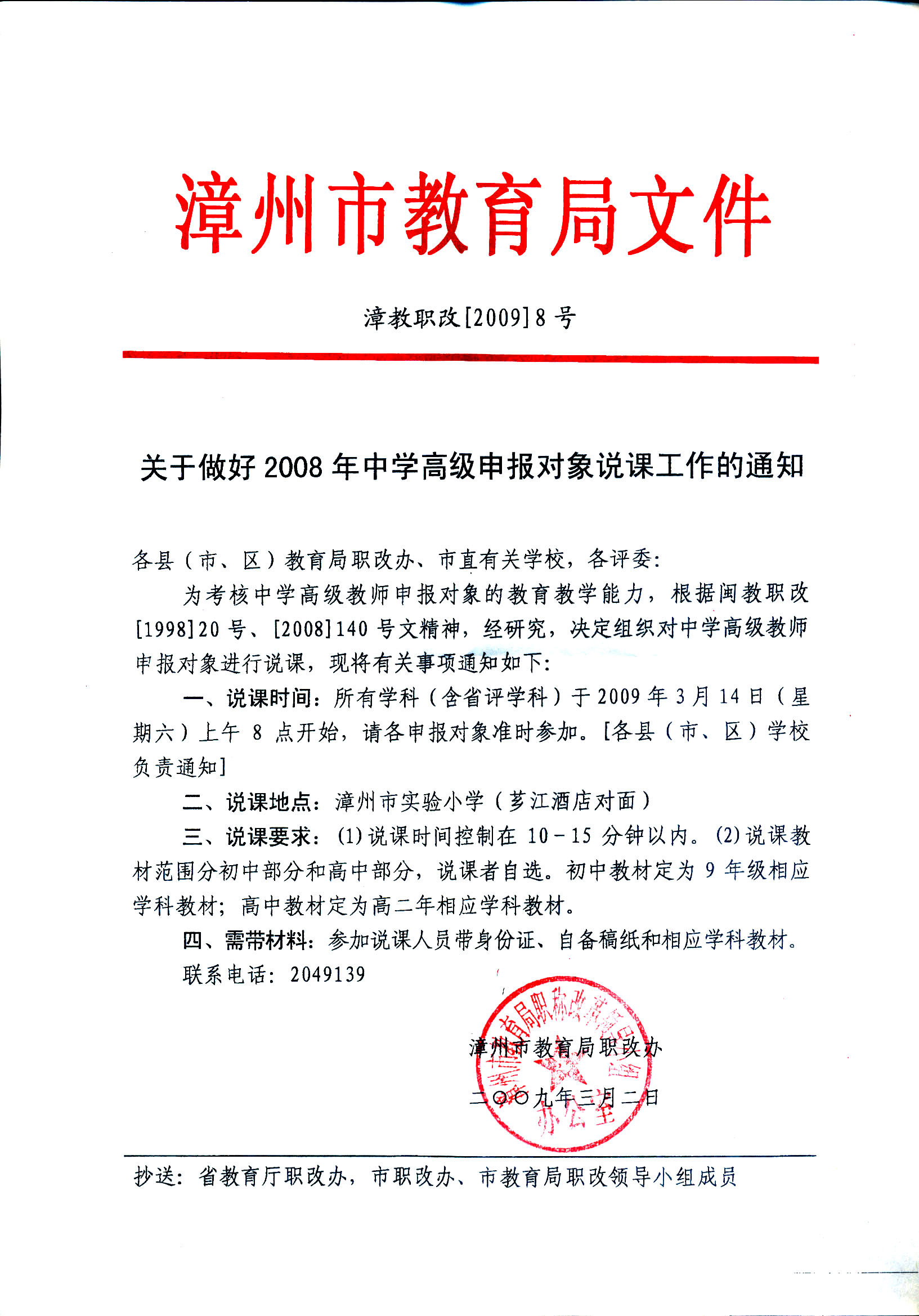 关于做好2008年中学高级申报对象说课工作的通知
