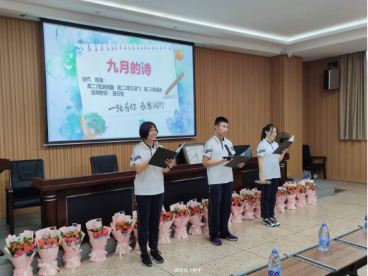 高二学生吴旭鹏、王凌飞、潘垚朗诵原创诗歌《九月的诗》,代表全校学生告白九月,礼赞师恩!