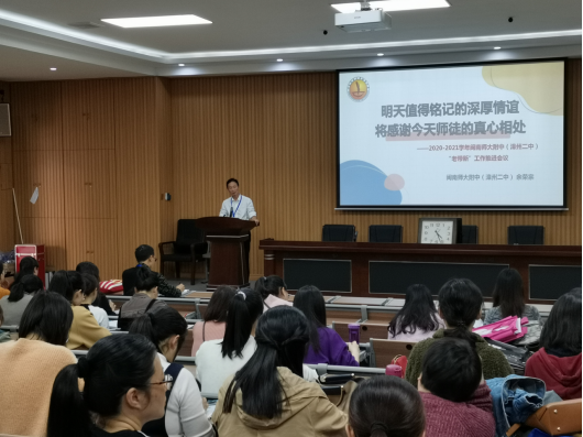 罗文旺副书记通过“有幸、博爱、珍惜”这三个关键词,号召新老教师在学校发展的新时代,珍惜好时光,发挥老教师的知识、能力和经验优势,全方位做好传帮带,在传授教学技能的同时,培养新教师的育人能力;鼓励新教师虚心向老教师请教,不断提高育人水平,共同为学校在“附中新时代”的发展贡献自己的力量。