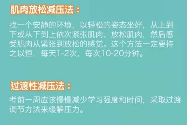 最后,附上一份考前减压小技巧,祝福每一名高三、初三学子决胜考场,在梦想的舞台上游刃有余!