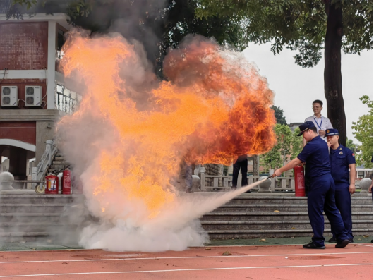 ”提、拔、握、压,对准火焰根部进行灭火。“在消防员的指导下,师生代表和行政领导现场演练使用干粉灭火器灭火,通过实战演练,师生们进一步掌握了灭火的要领。