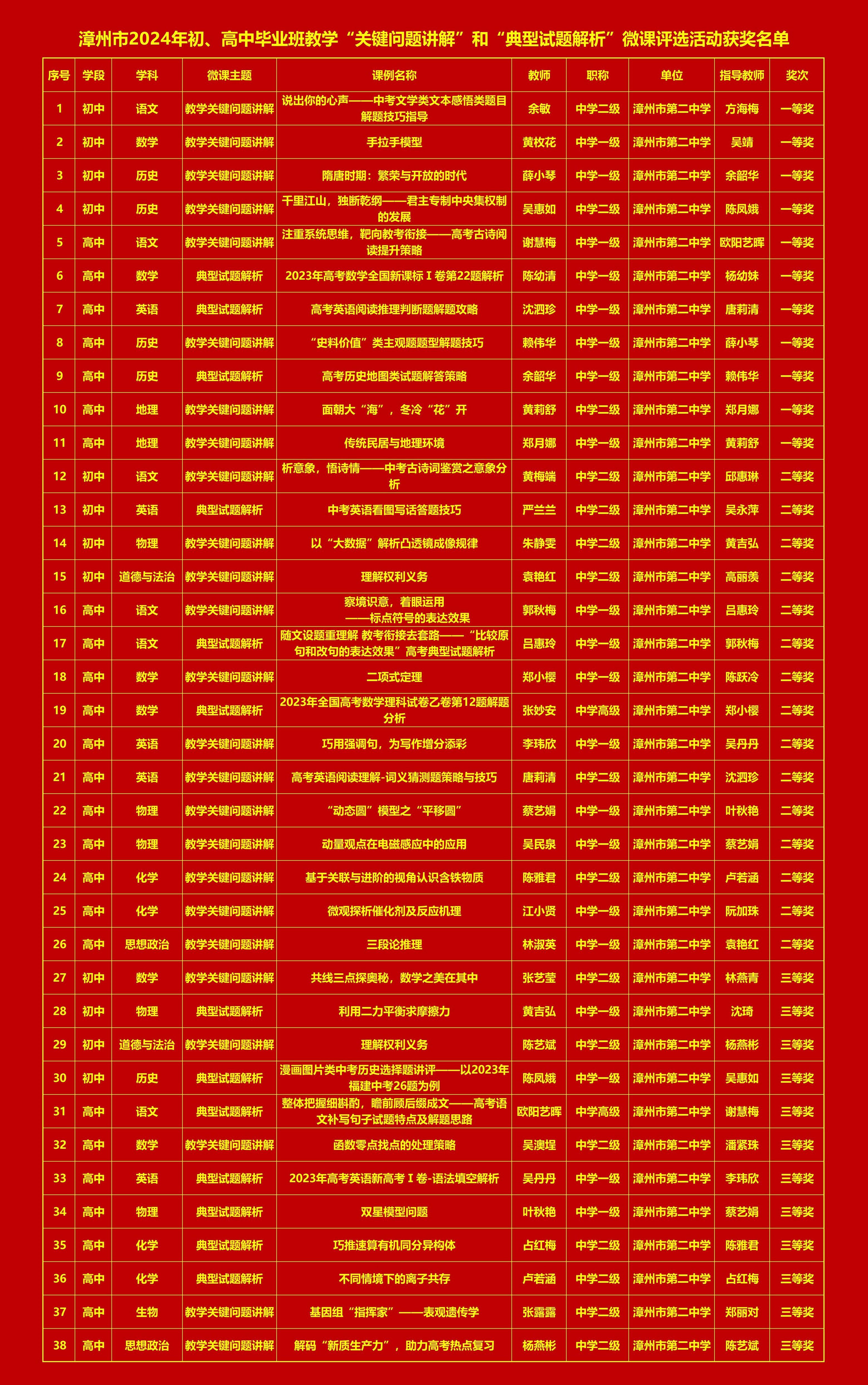 5月7日,漳州市教育科学研究院(漳州市教师进修学院)公布了漳州市2024年初、高中毕业班教学“关键问题讲解”和“典型试题解析”微课评选活动获奖名单。我校共有38名教师获奖,其中一等奖11名,二等奖15名,三等奖12名,特此祝贺!