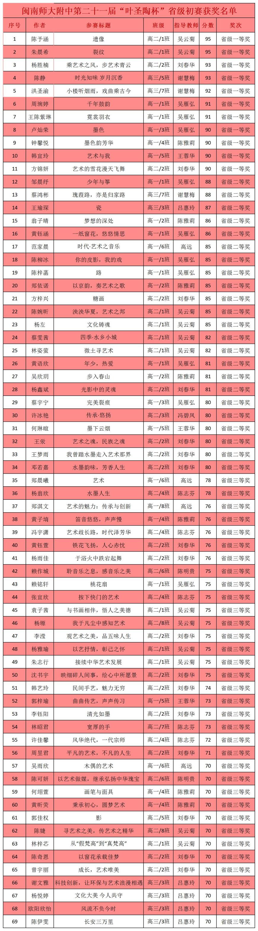 在刚刚结束的第21届“叶圣陶杯”全国中学生新作文大赛中,我校学子表现优异,共有69名同学获奖,共11名同学获得省级一等奖,23名同学获得省级二等奖,35名同学获得省级三等奖。其中,高二1班陈予涵、朱晨希同学以高分入围全国总决赛!