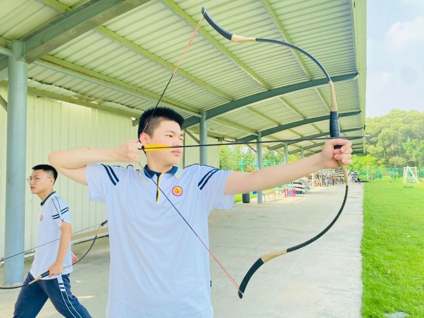 在射箭场,同学们提弓、搭箭、拉弦、射箭,一气呵成,尽显青春奋勇拼搏之风采。这一项中华传统体育运动,不仅让同学们体验一把“百步穿杨”的痛快,更引导学子们体悟射箭运动的静心专注、致力目标的精神。