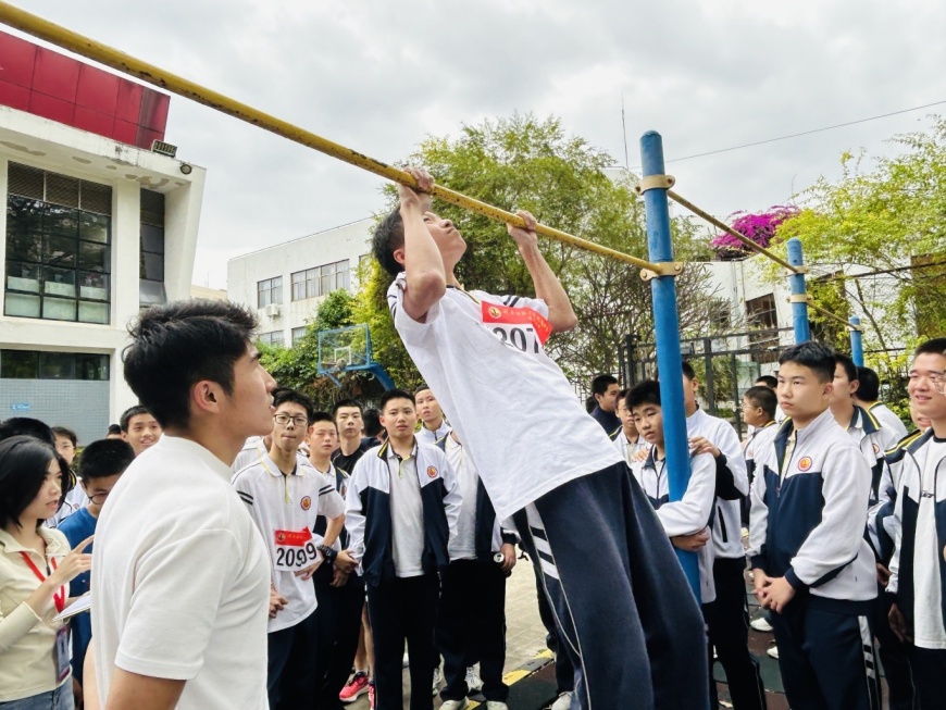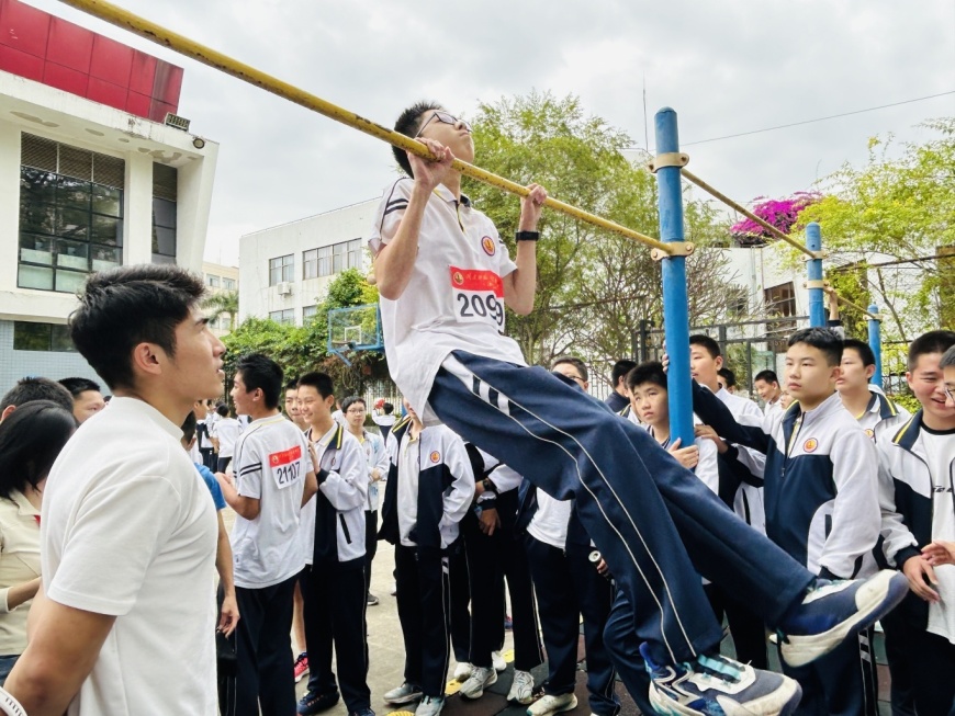 每一次引体向上,都是挑战地心引力的拼搏。肌肉紧绷,汗水洒落,于杠间勾勒坚持的画卷,书写运动会上的热血篇章。