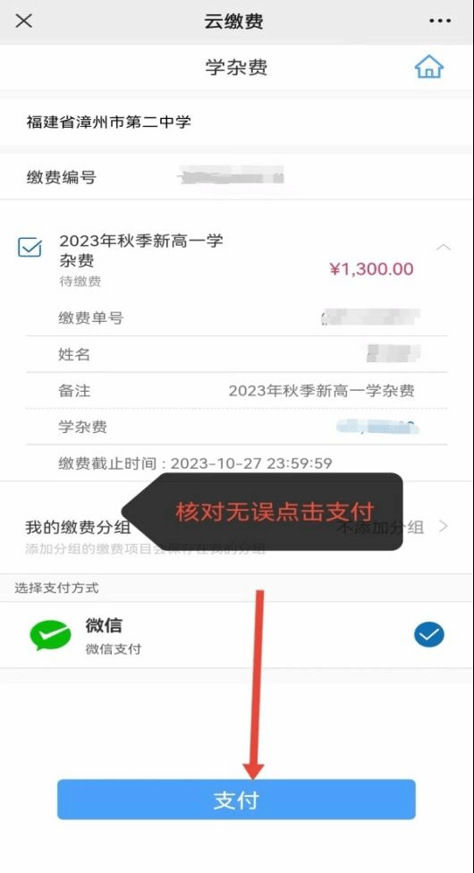 3.在“学杂费”页面便核对该编号对应的缴费信息,请务必核实该信息(姓名、考生号及学费金额)是否与缴费通知条中的信息一致,确认无误后方可按下一步缴费。