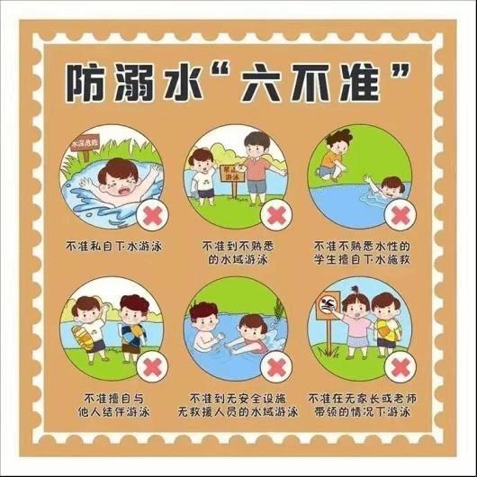 要加强对孩子的监管,特别节假日,禁止孩子在没有大人监护下擅自或结伴下河游泳、摸鱼、玩水等。重点要教育孩子做到“六不”:不私自下水游泳;不擅自与他人结伴游泳;不在无家长或教师带领的情况下游泳;不到无安全设施、无救援人员的水域游泳;不到不熟悉的水域游泳;不熟悉水性的学生不擅自下水施救。尤其要教育孩子遇到同伴溺水时避免手拉手盲目施救,要智慧救援,立即寻求成人帮助。