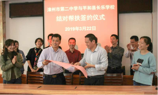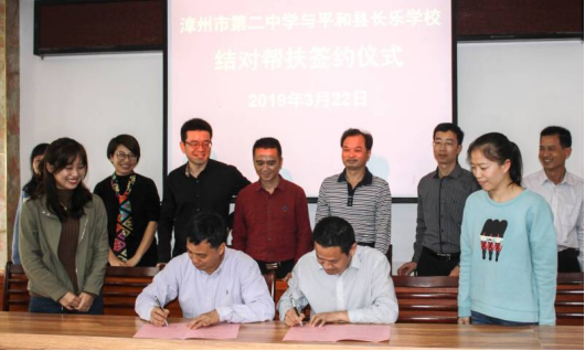 在双方领导老师的共同见证下,学校党委书记、校长林群鸣和长乐学校党支部书记、校长罗树荣代表双方学校共同签署了结对帮扶协议书。