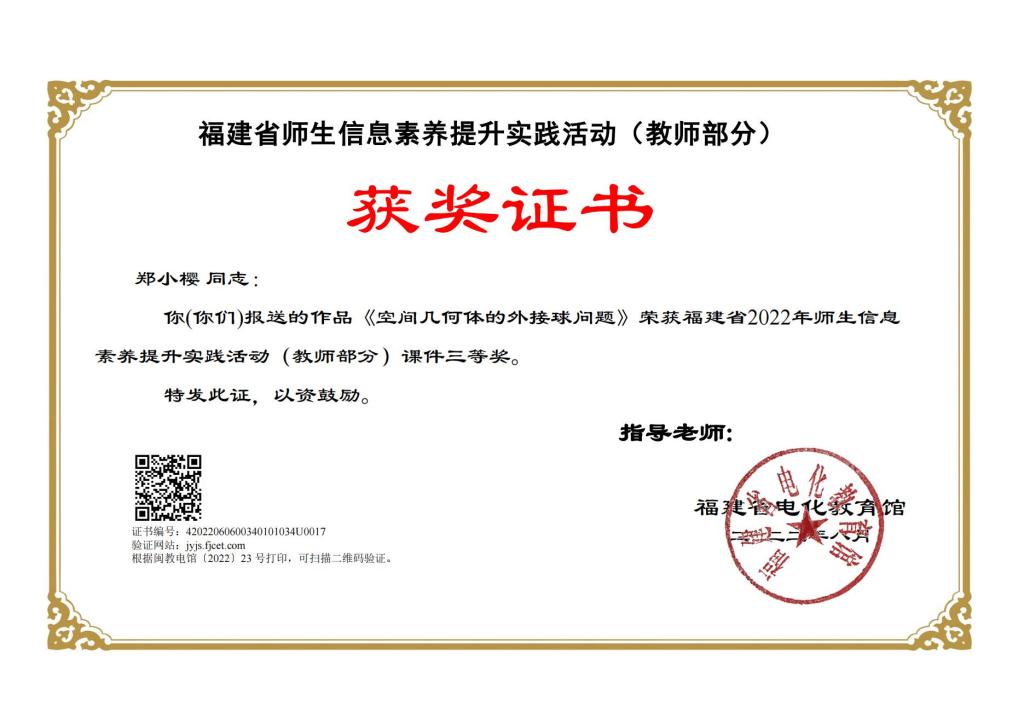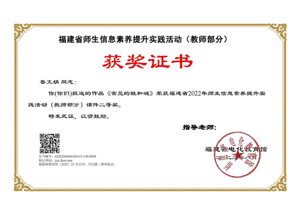福建省2022年师生信息素养提升实践活动(教师部分)我校鲁文娟、郑小樱老师获得省级奖