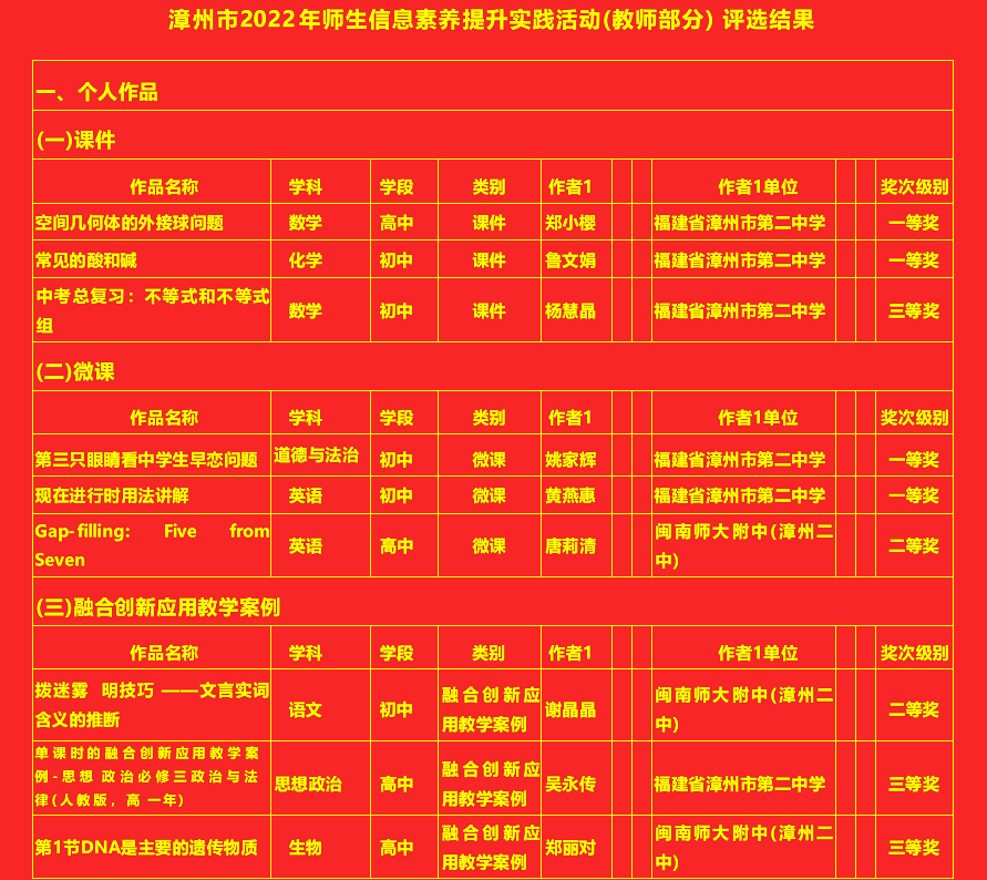 漳州市2022年师生信息素养提升实践活动(教师部分)市级获奖