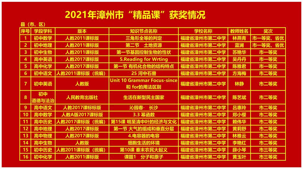 关于公布校在2021漳州市“基础教育精品课”市级获奖名单