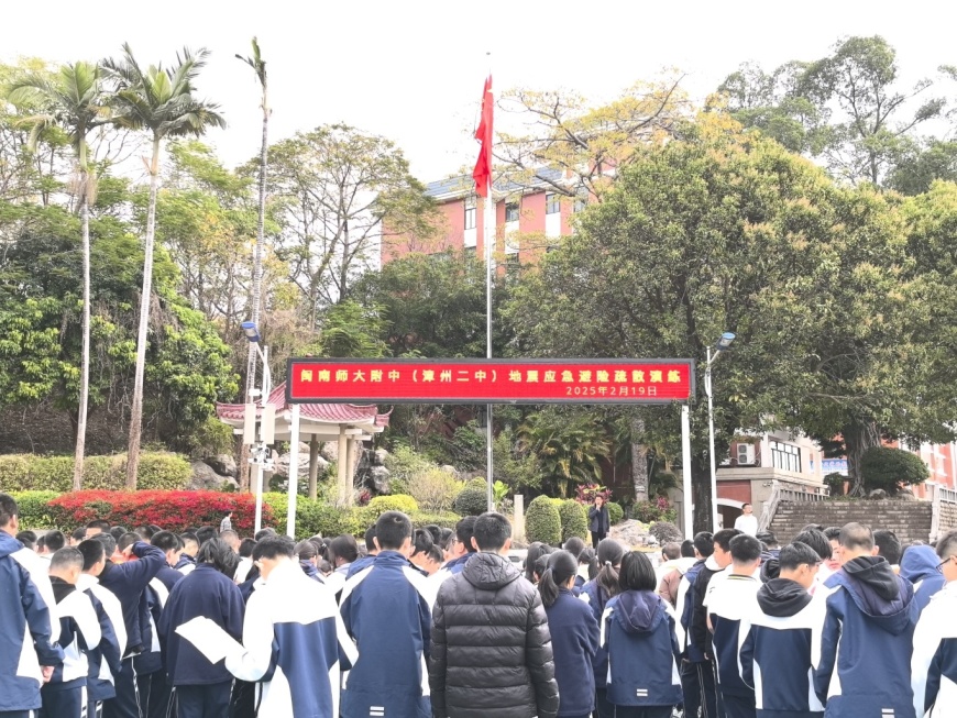 为进一步加强学校安全教育,普及有关防震减灾、地震避险知识,提高师生自救防范能力,2月19日上午,闽南师范大学附属中学(漳州二中)开展了2025年春季防震应急疏散演练活动。全校师生参加了本次演练活动。