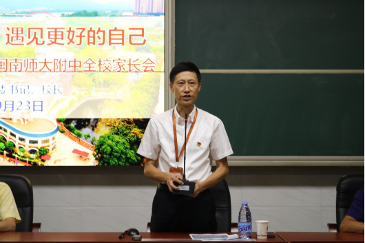 姚家辉校长代表学校热烈欢迎全校家长,向家长们介绍了学校“双一流”建设成效、各级家长委员会建设以及全校教育教学半封闭管理举措,并提出“全心全意为学生和家长服务,扎实有效提升教育教学质量”的指导思想。