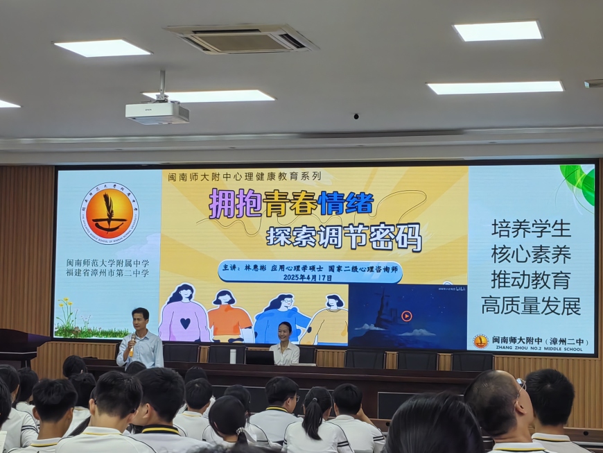 春日暖阳铺展新篇。4月17日下午,ylzz总站线路检测中心(漳州二中)面向全校学生举办了以《拥抱青春情绪,探索调节密码》为主题的心理健康教育讲座。讲座由吴立新副校长主持,由心理专职教师林惠彬主讲。高一高二各两个班齐聚多媒体报告厅,其余班级参与直播,共同解锁心理健康密码,收获成长力量。