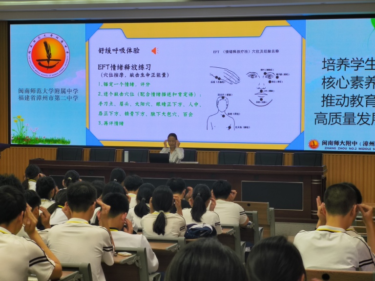 针对青春期常见的情绪困扰,林老师重点分享了三大实用调节技巧:一是“认知重构”,塑造积极思维;二是“舒缓呼吸练习”,通过4-7呼吸法平复紧张情绪;三是“EFT情绪释放技术”,林老师带领学生轻拍身体特定穴位,同时配合情绪描述和肯定语,帮助同学们在几分钟内释放负面情绪。现场学生跟随指导积极体验,沉浸式感受身心联结的奇妙力量。
