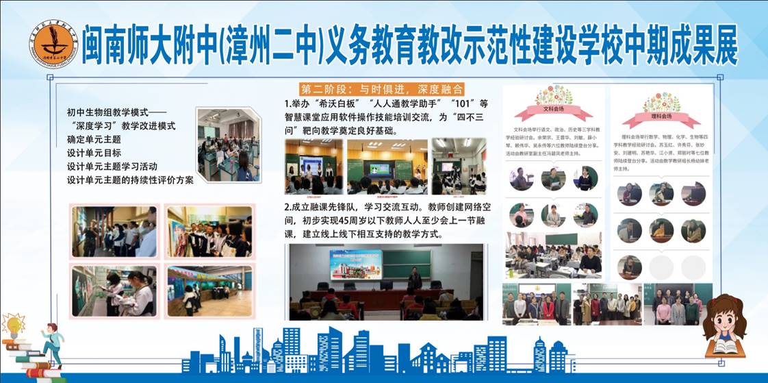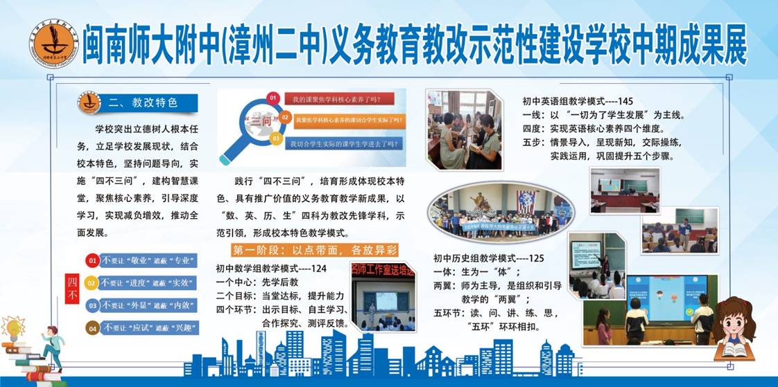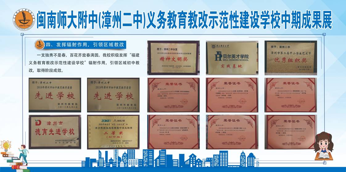 2017年12月,我校被福建省教育厅确认为福建省首批“义务教育教改示范性建设学校”,项目周期4年,迄今2年。