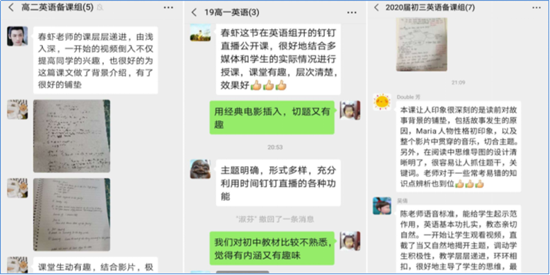 各组教师以“三问”自省,以“四不”互勉,结合各学科特点,针对课堂组织、师生互动、作业反馈、班级管理等方面,把自己的收获与思考进行分享,进行线上研磨,努力探索“停课不停教”高效线上教学模式。