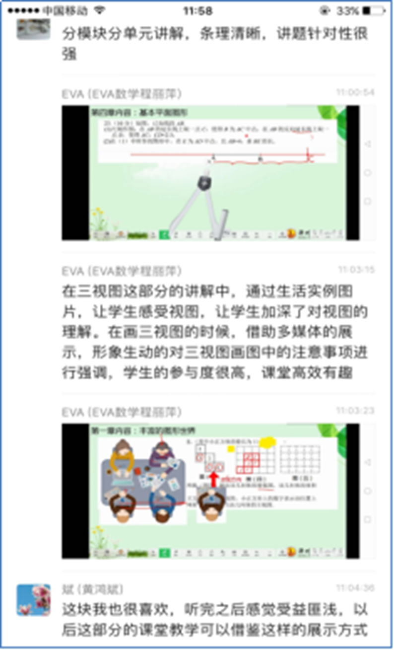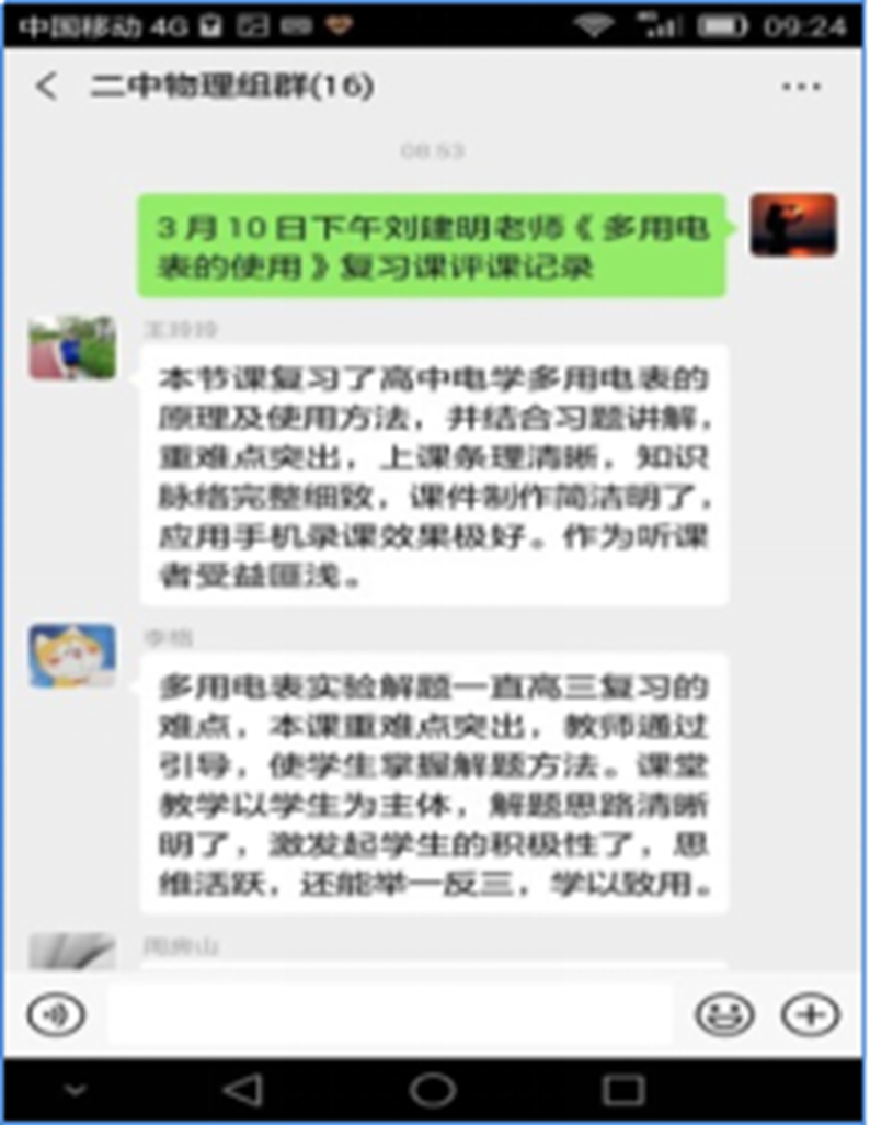 线上听课后,各组老师运用视频会议和群聊等功能,以“四不三问”理念为指导,积极开展“线上听评课,云端来教研”在线评课活动,围绕“线上教学经验分享与问题探讨、如何提升线上教学的有效性”等内容进行讨论;对课堂内容设置、教学环节把握、优质资源选取、师生在线互动、课堂连麦答疑、教学平台运用等方面进行深入研讨交流,共同学习开课老师线上教学成功经验,研讨在线教学过程中遇到的问题、困难,为提升线上教学质量建言献策!