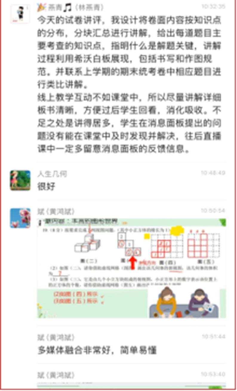 学校各年段、教研组、备课组全面运用直播平台开展线上联播授课教学。开课老师以“四不三问”靶向教学理念为指导,鼓励学生大胆“连麦”发问,积极参与线上课堂趣味互动,强化课堂互动,聚焦核心素养,引导深度学习。