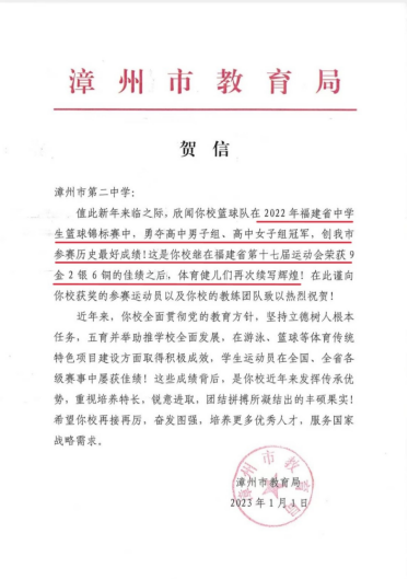 我校男子篮球队和女子篮球队在2022年福建省中学生篮球锦标赛上,在教练组郭宏、刘博、陈泽恺等教练精心教导下,顽强拼搏、众志成城,勇夺高中男子、高中女子篮球项目双料冠军,取得漳州市参赛历史最佳成绩!