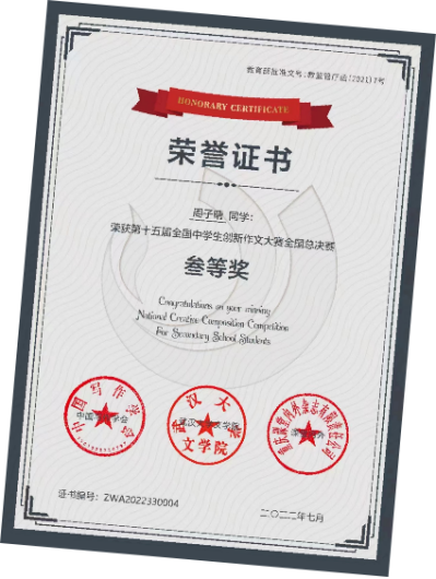 语文:何嘉乐同学获“叶圣陶杯”全国总决赛一等奖;陈巧霖、潘卉卉在第十五届全国创新作文大赛全国总决赛分获二等奖和三等奖;汤子杰荣获全国中学生科普科幻作文大赛三等奖;周子晴、杨育真在第十五届全国中学生创新作文大赛中荣获全国总决赛三等奖;陈羽希在第十九届“叶圣陶杯”全国中学生新作文大赛中荣获全国总决赛二等奖。