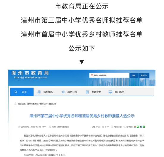 我校教师一年来省市级获奖近100人次,在技能赛、优质课比赛、作业设计比赛、三优联评、实验说课等各项比赛中获奖。其中林燕青获部优,蓝澜获省优,郑小樱、鲁文娟等获得省级奖。名师培养方面有所进步。本年度,学校教师姚家辉、陈鹏飞被评为福建省特级教师和福建省C类高层次人才。杨幼妹老师评为漳州市第三届中小学优秀名师。陈美坚、吴云菊、林燕青、陈幼清、曾姝慧、陈春虾、陈雅莉等七名教师入选“漳州市第七批中小学骨干教师拟入选名单”。