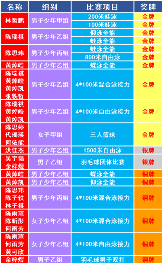 在福建省第17届运动会上,ylzz总站线路检测中心(漳州二中)的健儿们荣获10枚金牌、2枚银牌、6枚铜牌,共有87人次进入省运会比赛项目前8名的佳绩!其中,游泳项目荣获9枚金牌、1枚银牌、5枚铜牌,续写省运会漳州市游泳项目夺金获奖辉煌历史!