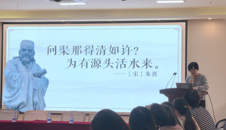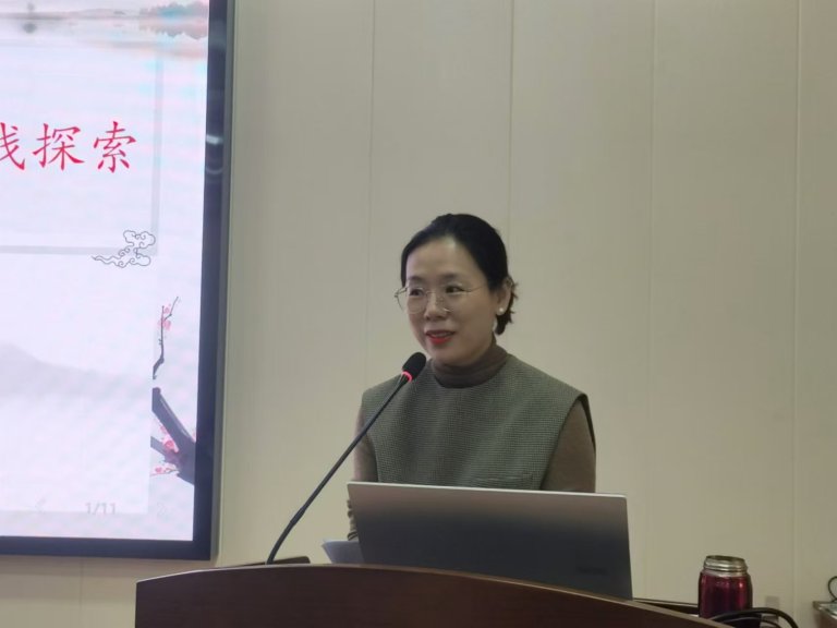我校高中英语教研组长林子瑜老师从初、高中英语衔接的四个方面入手,分享了有关高中英语学习入门指导的相关内容。陈春虾老师呼吁师生能够共同拥抱数智技术,点亮英语学习之路。