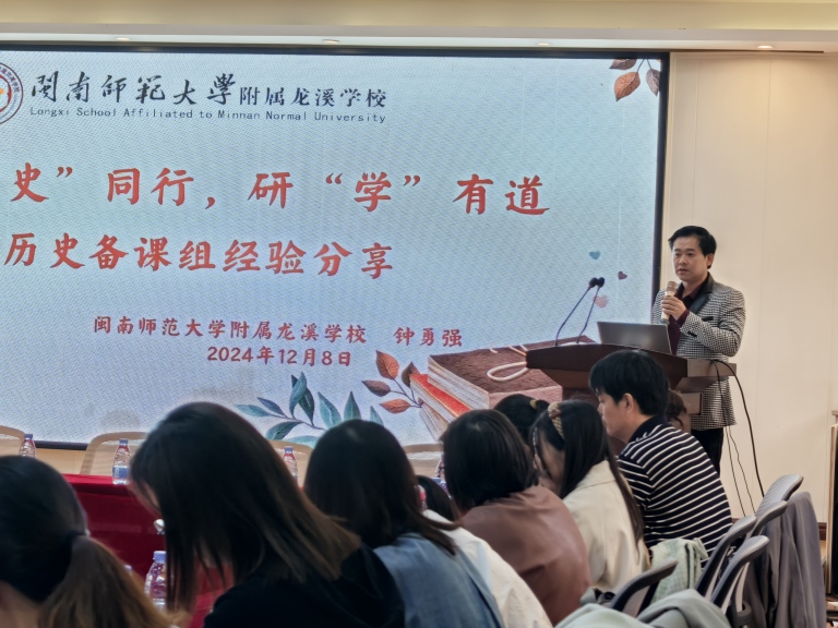 闽南师范大学龙溪附属学校钟勇强老师分享龙溪学校历史备课组教育教学经验,包括团队协作“四备”,培优辅差确定培优对象,研究新课标及中考新变化,研读专业论文分享讨论。