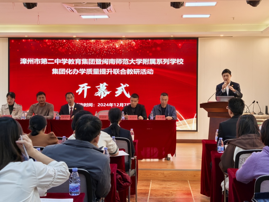 我校党委书记、校长姚家辉发言,希望通过此次活动进一步加强漳州市第二中学教育集团及闽南师范大学附属系列各中学交流合作,促进教师专业成长,优化办学机制,创新办学模式,激发办学活力,共研共进,共谋发展,不断提升漳州市第二中学教育集团办学质量及辐射作用。