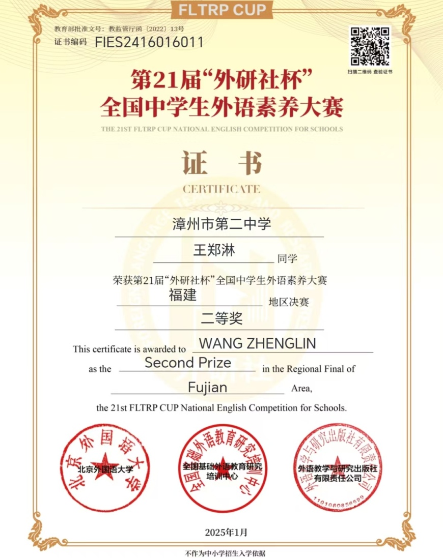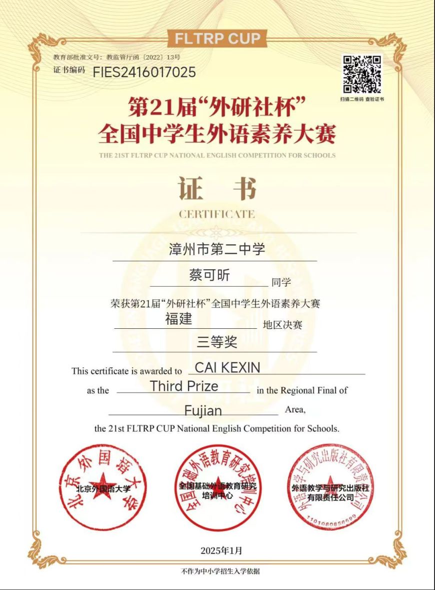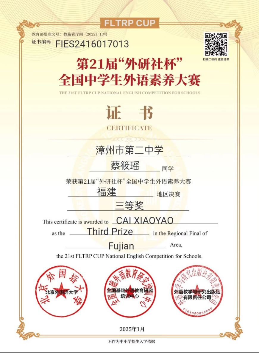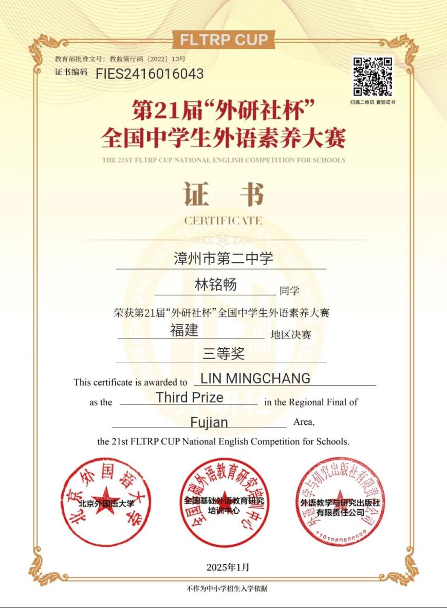 在刚刚落幕的第21届“外研社杯”全国中学生外语素养大赛福建地区决赛中,我校学子凭借扎实的知识储备,一举拿下多个奖项:一等奖1名,二等奖6名,三等奖8名。他们为学校赢得了荣誉,充分展现了我校学子的卓越风采与良好的精神风貌。