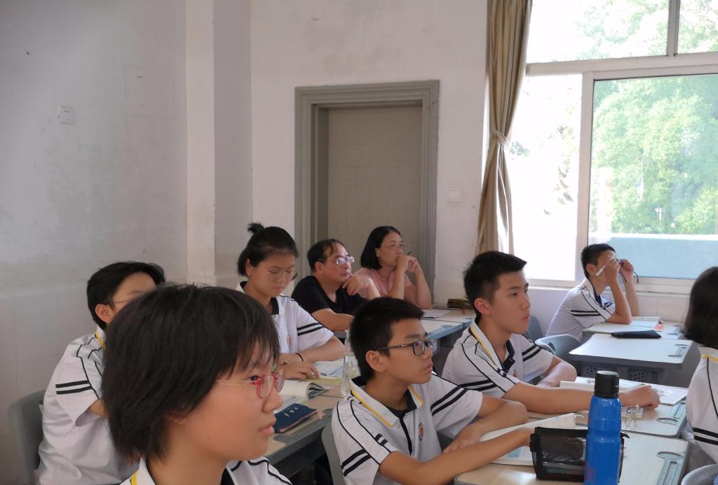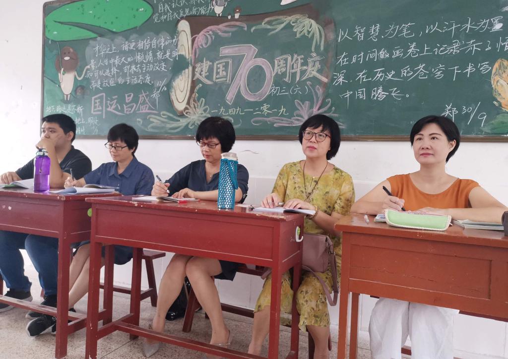 教研员们在党委副书记罗文旺、教务处副主任苏玉红、教研室副主任冯碧凤等行政领导、各年段长和学科老师陪同下,走进初中各年段推门听课、深入评课,参加各学科教研组、备课组教研活动。