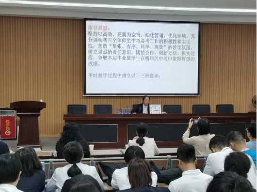 初三年段长郑小玲老师对年段工作进行汇报,初三年段坚持以高效、高质为宗旨,细化管理,在练习和考试方向把握一个“准”字;教学落实一个“实”字,开展各科培优补差工作;年段管理狠抓一个“细”字;激励学生力求一个“新”字。