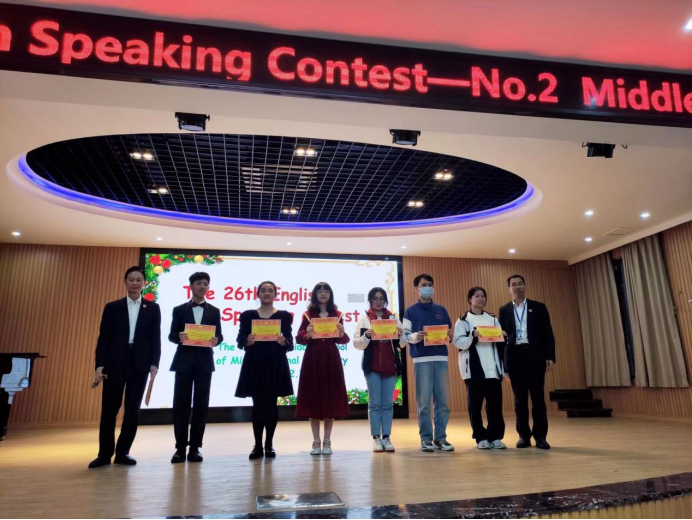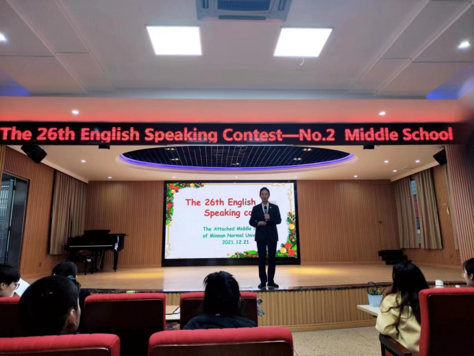 2021年12月21日下午,我校英语组在音乐厅举行了一场别开生面的英语演讲比赛。学校党委副书记罗文旺与副校长余荣宗莅临观摩指导。活动由英语教研组组长蔡桂香、林子瑜老师精心策划,英语教研组全体教师组织开展。活动还邀请了闽南师范大学5位嘉宾担任评委。