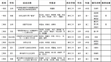 以上9个项目中,科技创新项目《加州鲈鱼源维氏气单胞菌拮抗菌筛选及其生物学特性的研究》、《试管开花初探》,科技实践活动《如何让城市不再“看海”》经漳州市科协推荐,将参加福建省第38届青少年科技创新大赛。