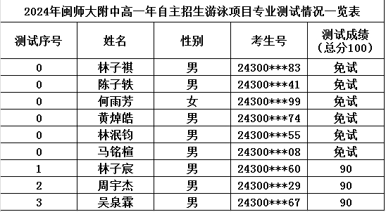2. 根据漳州市教育局下发的《漳州市教育局关于做好2024年漳州市普通高中学校自主招生工作的通知》(漳教规[2024]3号文件),及漳州市教育局、漳州市体育局联合下发的《关于进一步做好我市中小学校优秀体育后备人才特招工作的通知》(漳教体[2002]136号)相关规定,林泽涵、林晨榕、林子祺、陈子轶、何雨芳、黄焯皓、林泯钧、马铭楦等八名考生曾获省级(含省教育厅、省体育局)体育竞赛个人前三名或前三名主力队员,且申请免试考生数未超过该项目招生数,经中教科批准,予以专业测试免试。